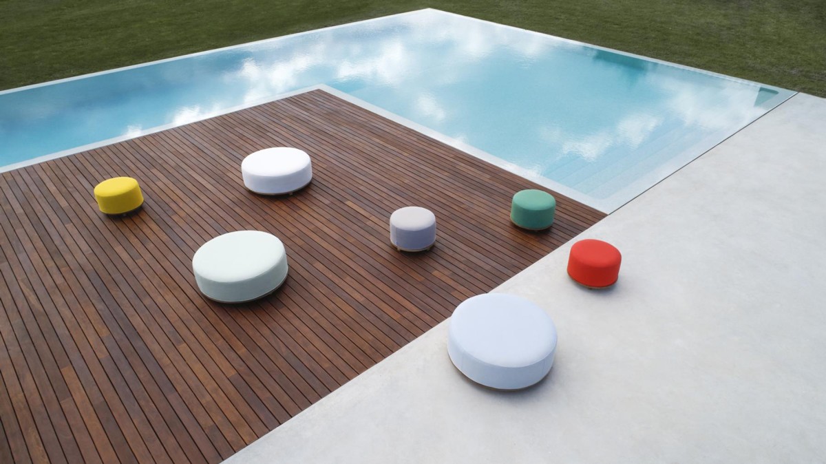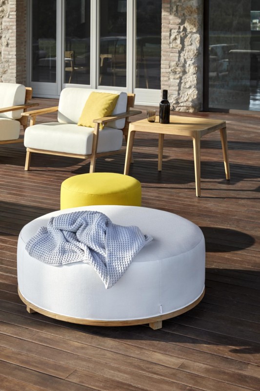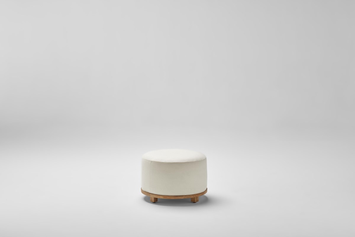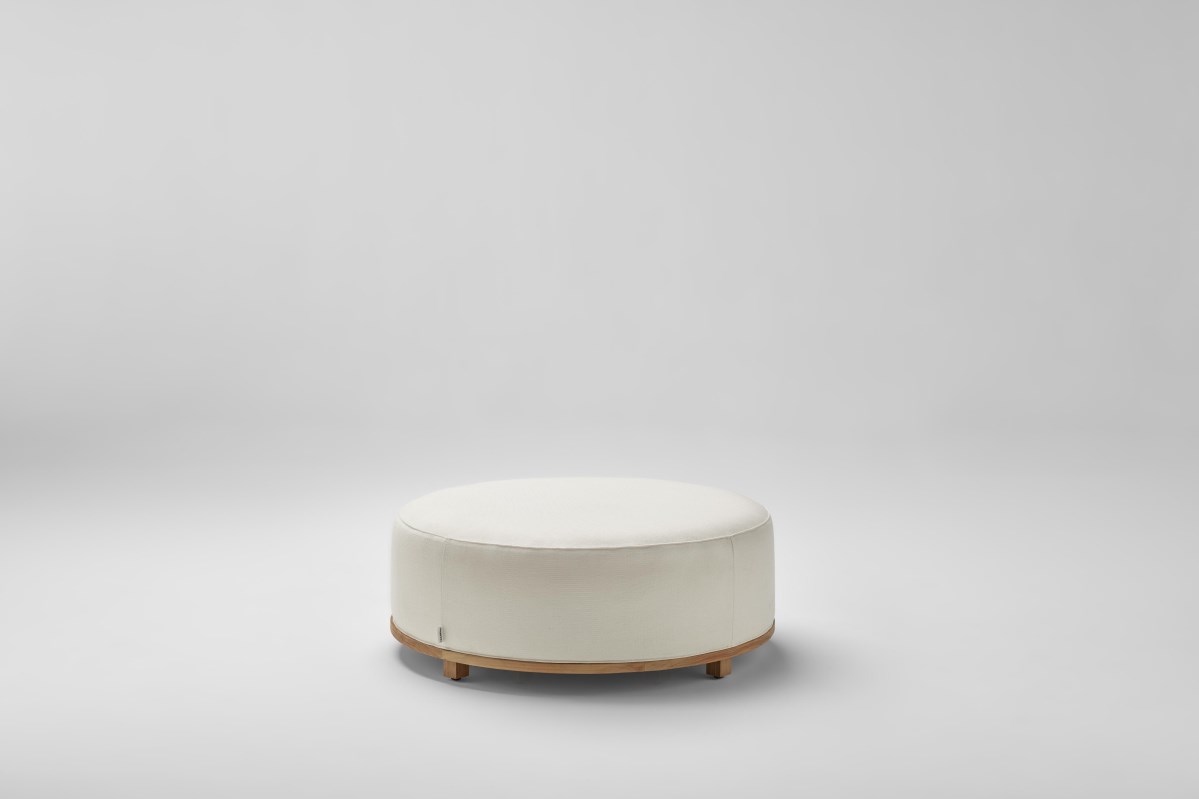 Pouf composto da base rotonda Ø100 o Ø56 centimetri in teak di classe A proveniente da foreste sostenibili a taglio controllato dell'Indonesia, cuscino di seduta in schiuma da 35 kg. ad alta resistenza rivestito con federa interna impermeabile e federa esterna con tessuti del campionario Point.