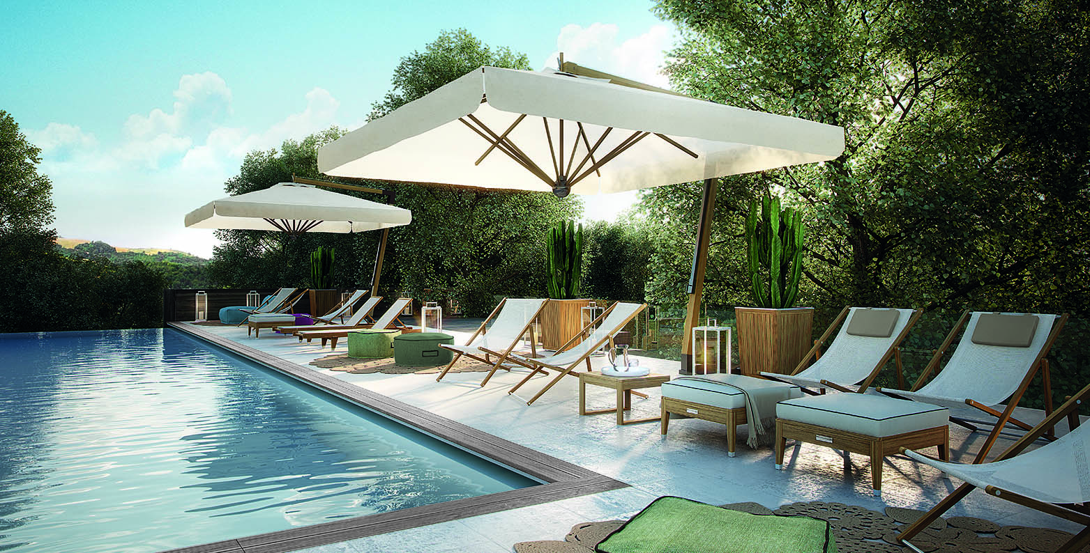 Strutture in TEAK massiccio Asiatico e dettagli in acciaio satinato. Seduta in tessuto termosaldato per esterni textilene bianco o nero.