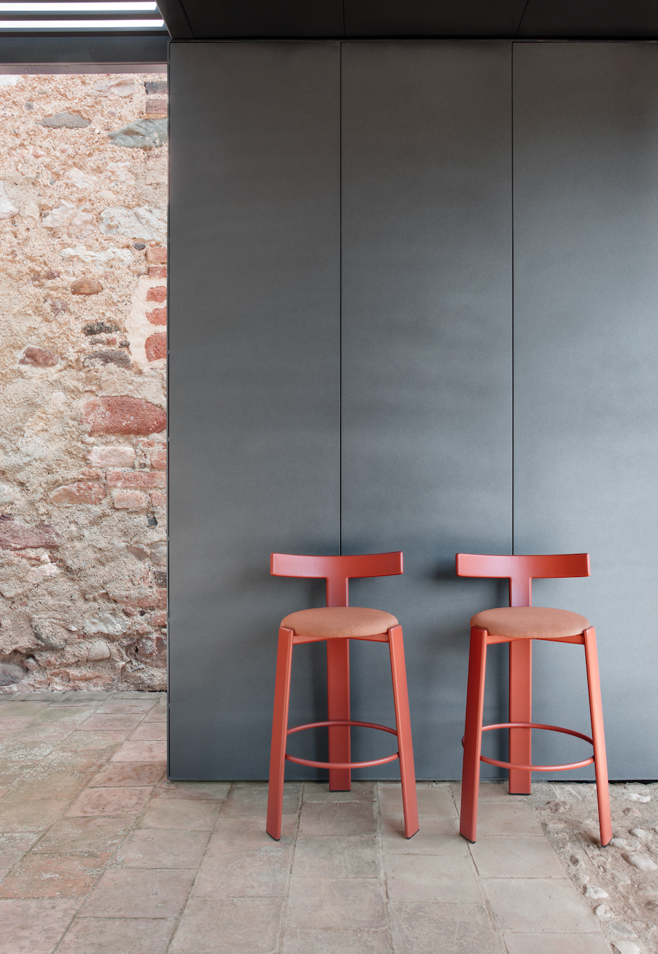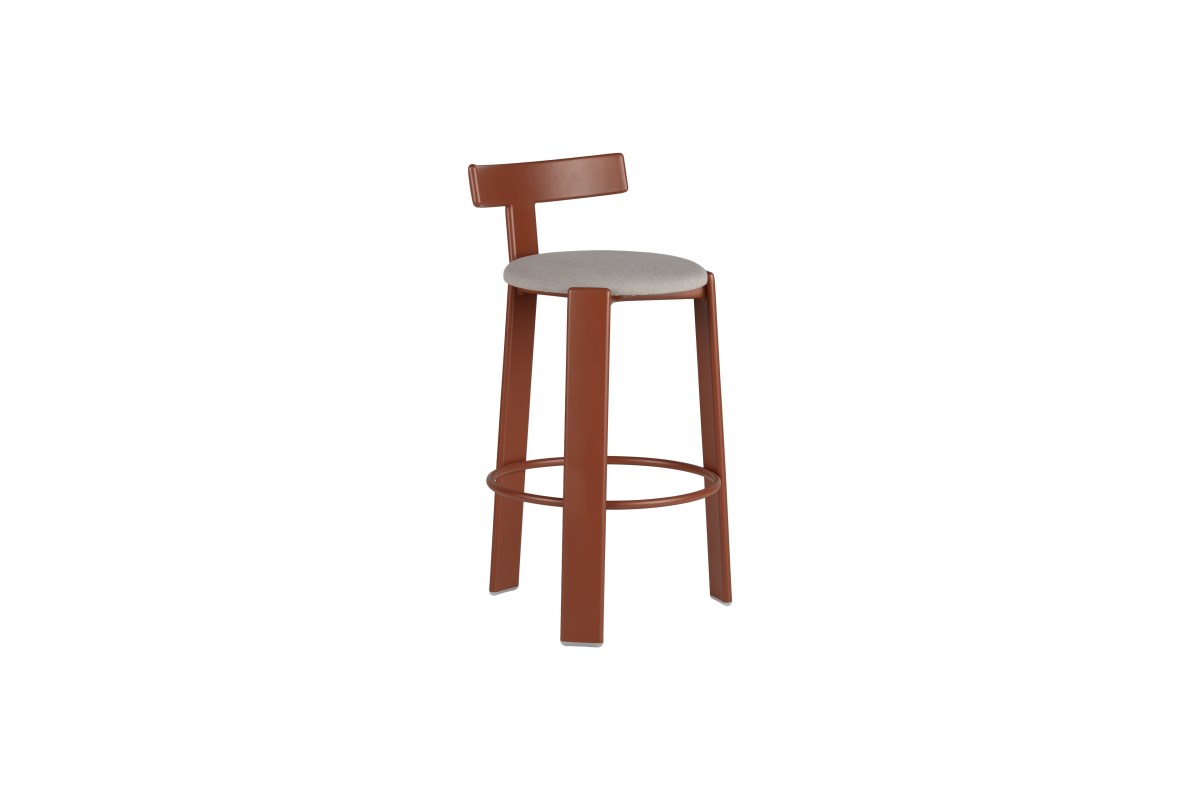 Sgabello bar. Struttura alluminio verniciato a polvere. Finitura in otto colori crema 34, grigio 56, bianco neve 70, sabbia 74, ruggine 75, terracotta 72, verde ficus 73, celeste 71. Cuscino seduta in poliuretano espanso di 35 kg alta resistenza con fodere in tessuto campionario Point.
