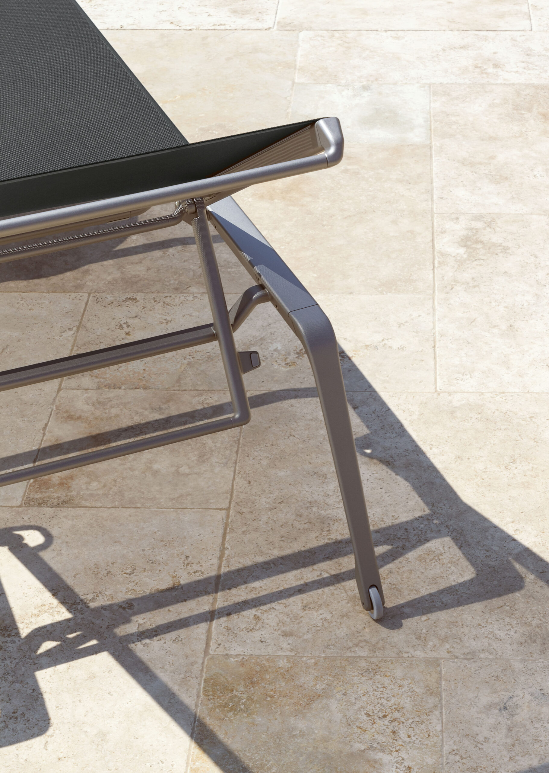 Immancabile a bordo piscina o sopra un prato tagliato di fresco, il lettino Ushuaia restituisce un’immagine perfetta di ciò che usualmente si definisce “relax estivo”. La struttura in alluminio è disponibile in 5 colori (bianco, grigio metallo, oro perlato, grigio polvere e iron grey) e il tessuto sintetico in tre tonalità. Ushuaia è provvisto di ruote, così da poterlo spostare o posizionare con facilità. Impilabile, ha schienale reclinabile in 7 posizioni. Cuscino su richiesta.