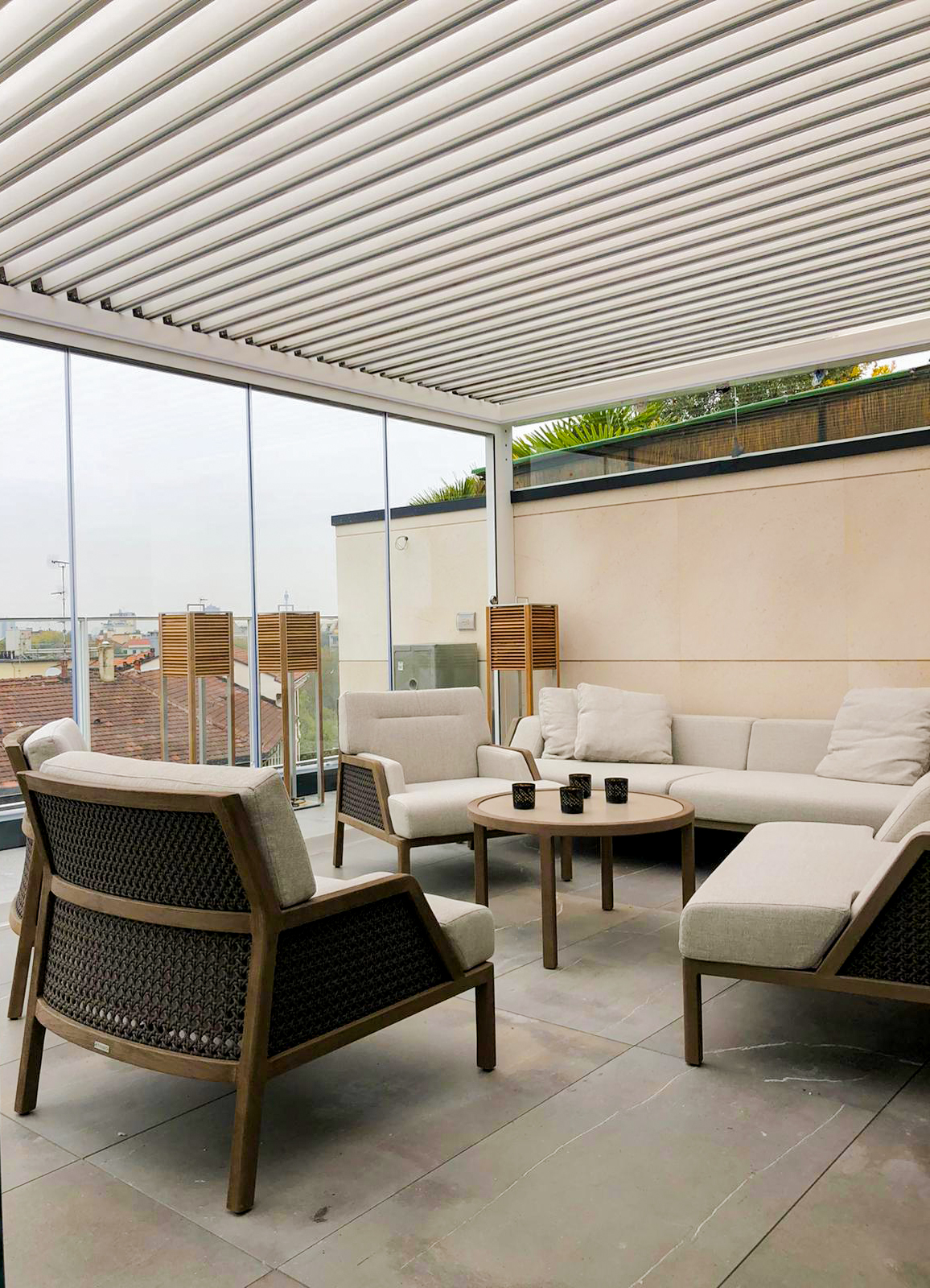 - Zona living, fruibile in ogni stagione grazie alla copertura garantita da una struttura a lamelle orientabili di larghezza 4,95 mt., sporgenza 4mt.